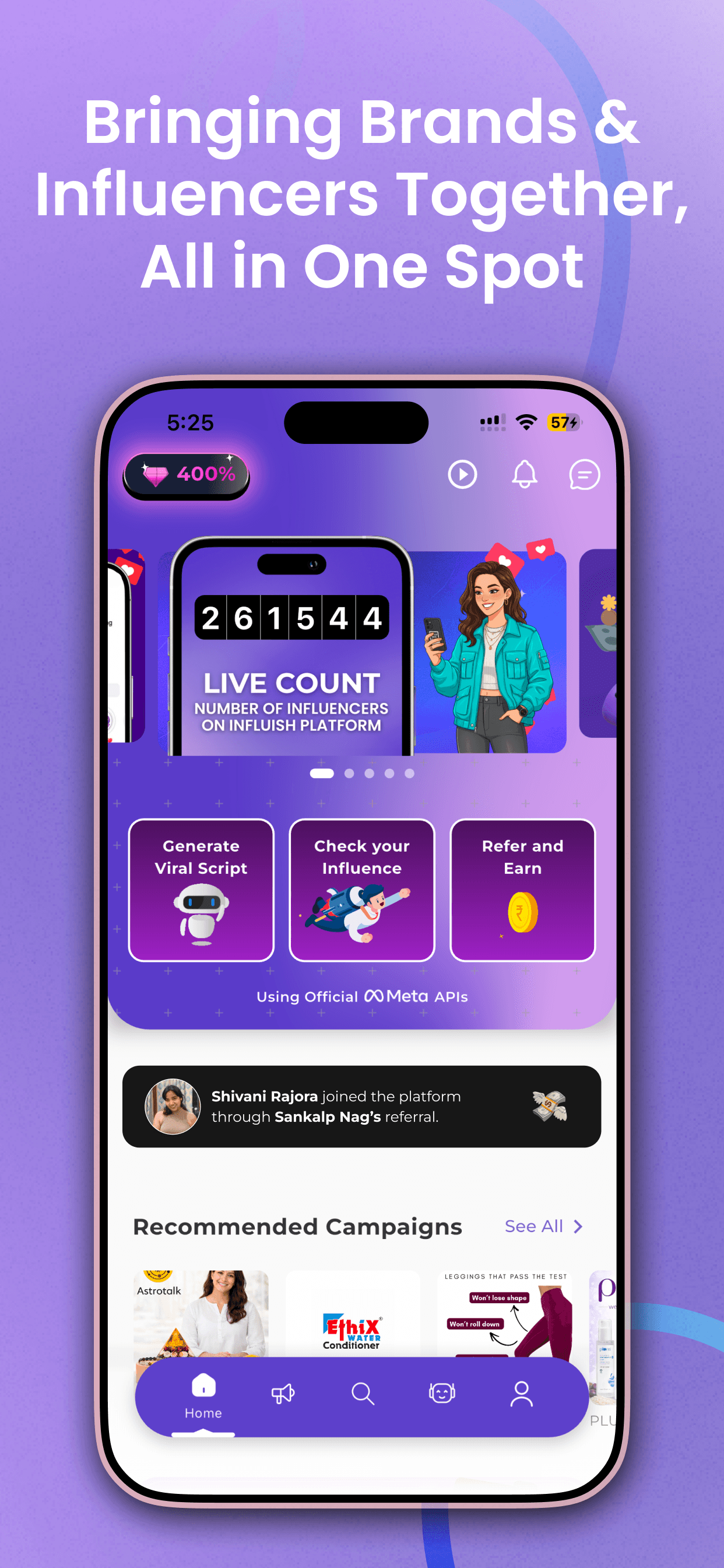 Discover Influencers who align with your brand’s vision. Get access to verified influencers ready to bring your campaign to life.